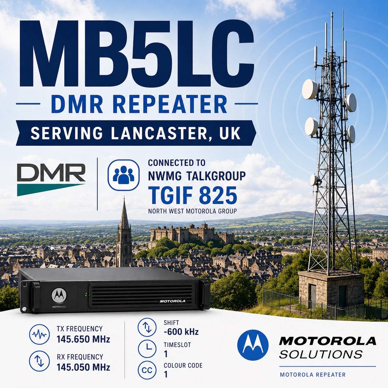 MB5LC is a 2m Motorola DMR repeater connected to the NWMG network. It is located on the south side of Lancaster and covers the surrounding areas, Morecambe Bay and south towards Forton and beyond.